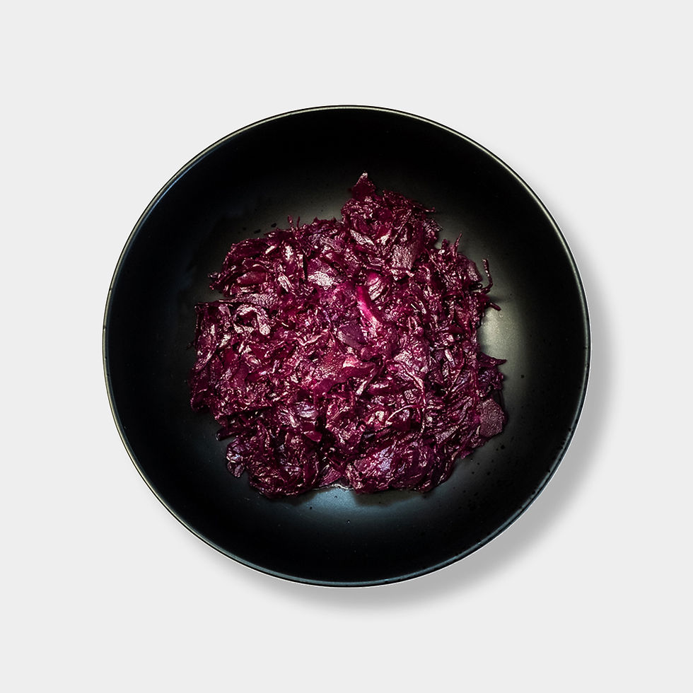 Frisches Rotkraut, Rapsöl, Apfelmus, Gewürze, Preiselbeeren.